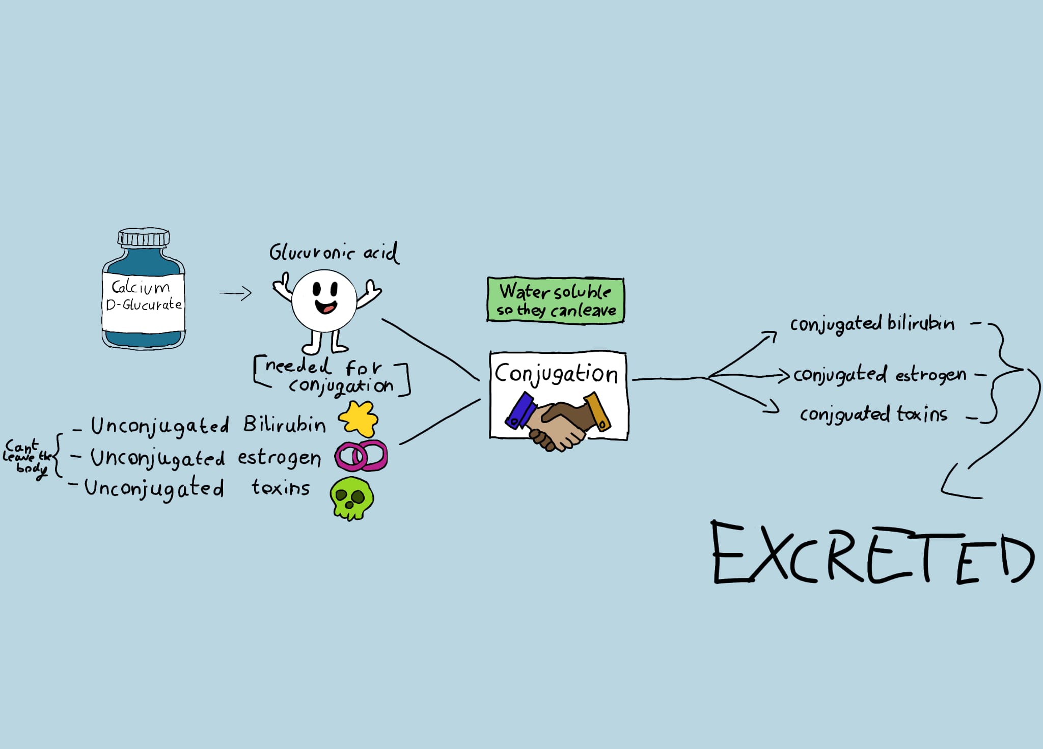 Your liver attaches glucuronic acid to these substances in a process called glucuronidation. This “tag” (conjugation) makes them water-soluble, allowing them to be safely eliminated through bile and urine.