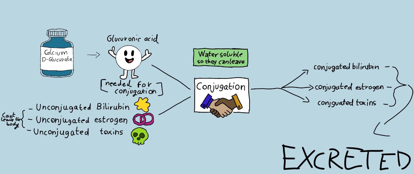 Po drugie, D-glucaro-1,4-lakton może przekształcać się w kwas glukuronowy, cząsteczkę, której wątroba używa w glukuronidacji do oznaczania produktów odpadowych, czyniąc je rozpuszczalnymi w wodzie i bezpiecznymi do wydalenia.