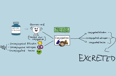 Twoja wątroba przyłącza kwas glukuronowy do tych substancji w procesie zwanym glukuronidacją. Ta „etykieta" (koniugacja) sprawia, że stają się rozpuszczalne w wodzie, pozwalając na ich bezpieczne wydalenie przez żółć i mocz.
